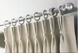 Curtains All our curtains are now hand sewn. This ensures an invisible stitch, which adds a genuine quality feel to your curtains. You will be amazed at the differnce this makes, especially when compared to other curtains .There are many different styles of curtains available. Most popular are those shown to the right. All type will hang equally well on a pole or a track. What can look stunning though are simple curtains combined with a luxurious upholstered pelmet. Alternatively, if you prefer a more streamlined look then there is an amazing range of poles called atmosphere which can dazzle even the plainest of rooms.