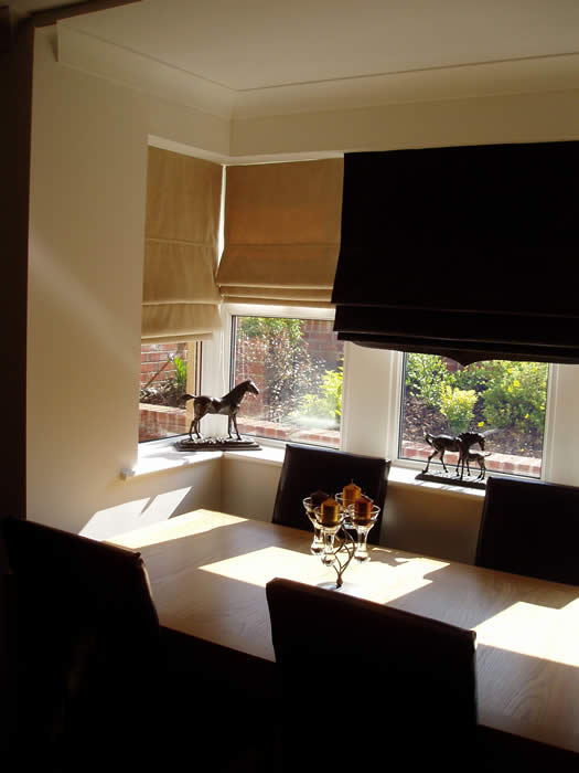 Roman Blinds Add warmth and sophistication to your home with our beautiful Roman blinds. Roman blinds are easy to adjust the height that you require without the use of a cleat. We only use a chain operated system similar to a roller blind. All our blinds are fully lined with Blackout lining which gives you a modern alternative to curtains. With our huge collection of soft fabrics, from plain to prints, suede to even leather, there will be a style to suit any room in any home, whether it is modern or classic in design. There is even a choice of scalloped finishes to enhance your blind further, such as wavy, Taj Mahal, or the classic scallop. |
