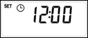 All time settings are based on a 24 hour clock. Press the “Set” button once, the clock symbol will now be displayed. The time can now be set by pressing the “<” button to change the hour and the “>” button to change the minutes. To continue press the “Set” button to go to the next mode setting.