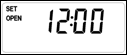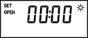 The display will now be as shown below. The open time can now be set by pressing the “<” button to change the hour and the “>” button to change the minutes. To continue press the “Set” button to go to the next mode setting.
