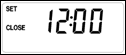 The display will now be as shown below. The close time can now be set by pressing the “<” button to change the hour and the “>” button to change the minutes. To continue press the “Set” button to go to the next mode setting.