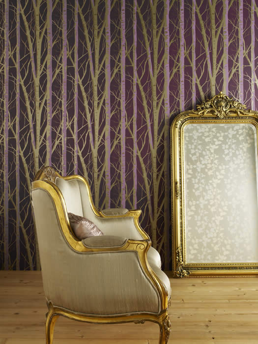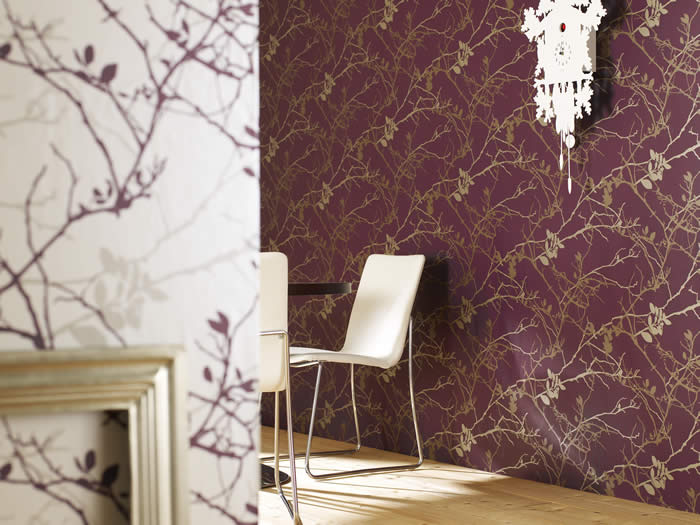 Wallpaper Natural forms enhanced by a pearly finish ensure a stunning impact for the Woodland collection of wallcoverings. Lead design Beechwood features slender stems tipped with life-sized leaves, all catching the light to create subtle silhouettes, whilst Coppice highlights a delicate filigree of time-gnarled twigs. Birch and Aspen evoke wooded glades and the collection is completed by the versatile Hedgerow plus the striated Veneer. Colourways range from dewy Pearl and Porcelain to deep Onyx and Bronze, with selected designs in statement shades of Olive, Fuchsia and Marine.